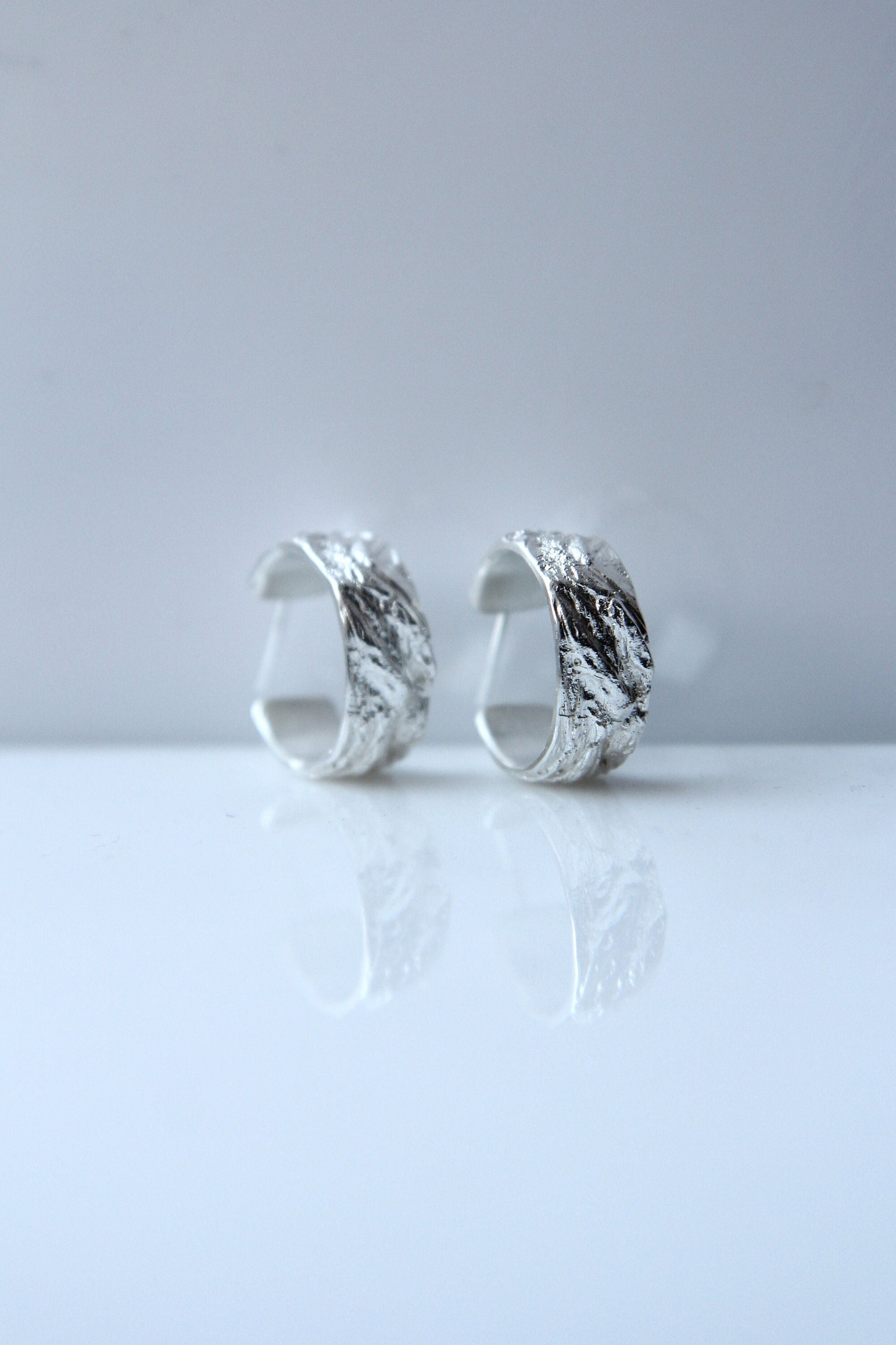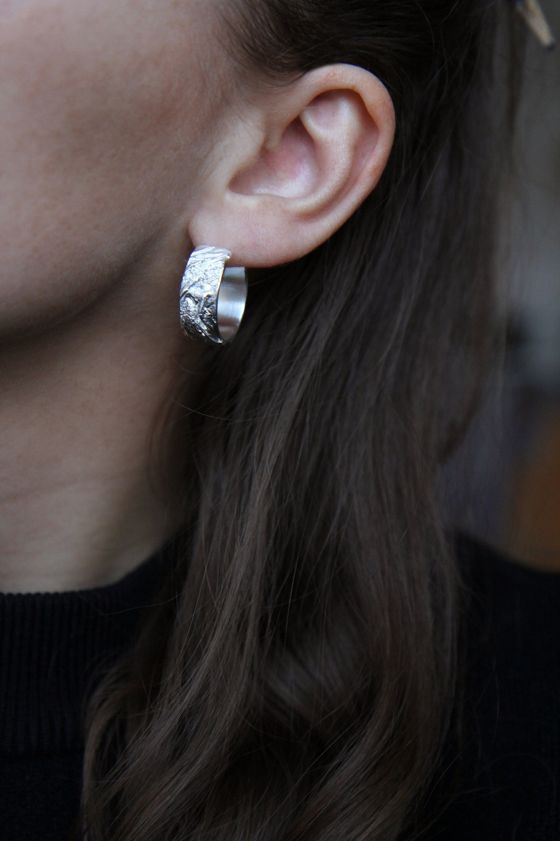 Unique, handmade, aesthetic and minimalistic silver open circle hoop stud earrings with artistic and unique texture. Casted in lost wax technique. A perfect way to update and freshen up your style and outfit. Perfect for both - everyday and occasional wearing. Bold but jet so feminine.