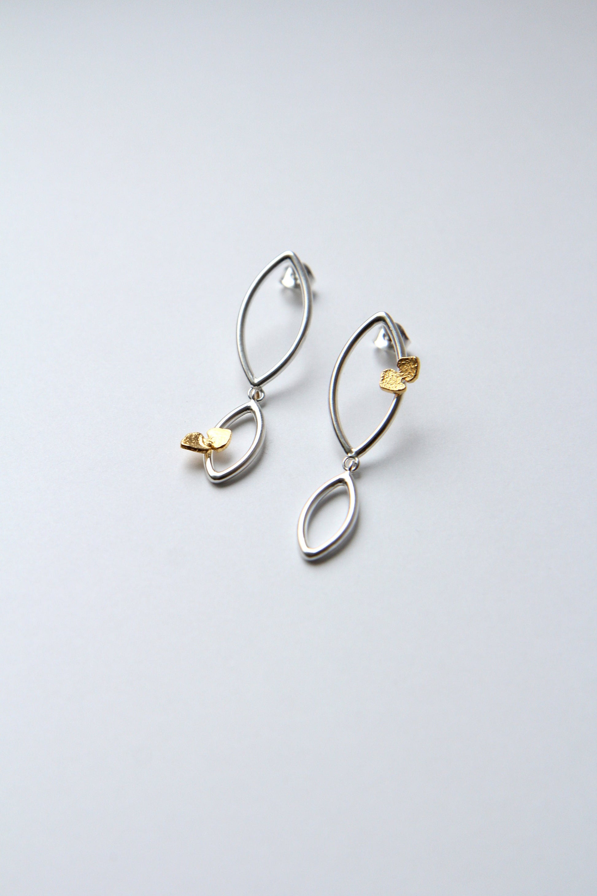 Unique, handmade silver petal form stud dangle earrings with gold plated leafs. Material - 1,5mm round profile silver wire curved in leaf form and put together in chain. A perfect way to update and freshen up your style and outfit. Perfect for both - everyday and occasional wearing.